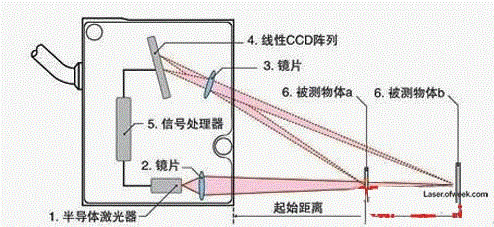 激光發(fā)射器通過鏡頭將可見紅色激光射向物體表面,經(jīng)物體反射的激光通過接受器鏡頭,被內(nèi)部的CCD線性相機(jī)接受,根據(jù)不同的距離,CCD線性相機(jī)可以在不同的角度下“看見”這個光點(diǎn)。根據(jù)這個角度即知的激光和相機(jī)之間的距離,數(shù)字信號處理器就能計(jì)算出傳感器和被測物之間的距離。