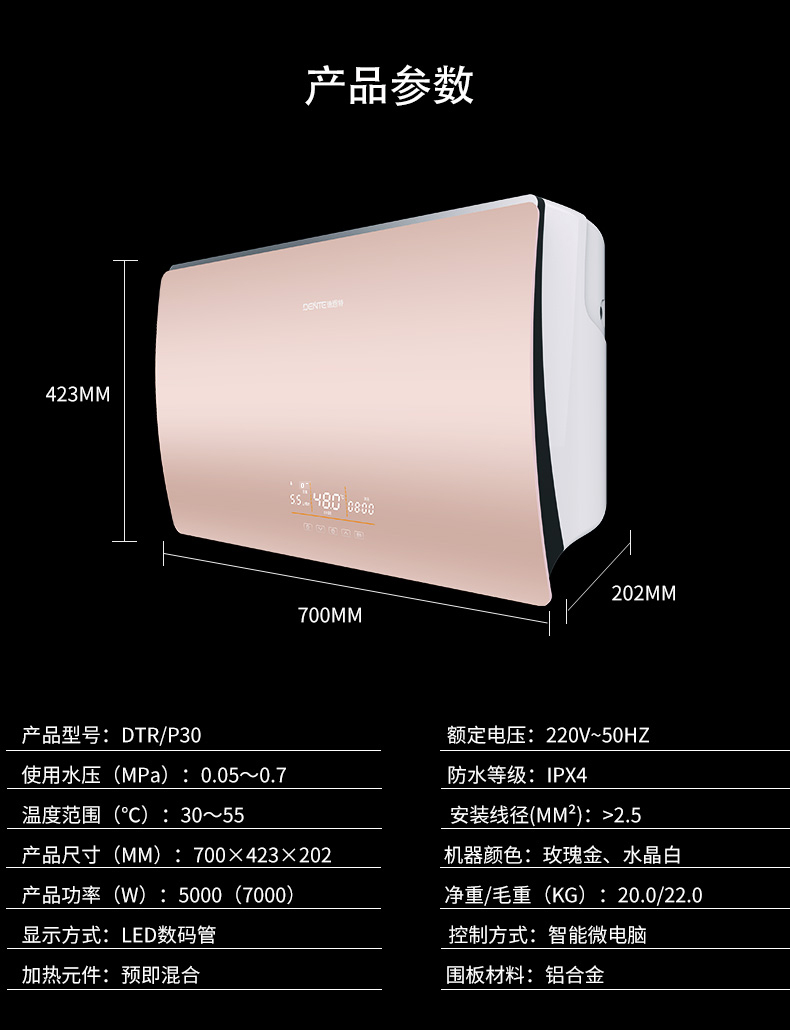 速熱式電熱水器DTR-P30玫瑰金智能恒溫出水